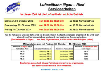 Willkommen bei der Luftseilbahn Illgau-Ried Bitte beachten Sie links unter „Betrieb“ die Betriebszeiten und die Bedienung der Bahn. Pro Kabine dürfen maximal 6 Personen einsteigen. Die Fahrt dauert 3 Minuten. Wir freuen uns auf Ihren Besuch. Luftseilbahn: Die im Jahre 1995 komplett erneuerte Bahn ist das einzige öffentliche Verkehrsmittel, das das Muotathal mit dem Dorf Illgau verbindet. Die Sechs-Personen Bahn überwindet dabei in nur drei Minuten eine Höhendifferenz von 227 m auf einer Länge von 374 m. Velos können transportiert werden. Ausserhalb der Betriebszeiten kann die Bahn mittels Jeton-Betrieb/Punktekarten jederzeit selbstständig bedient werden. Illgau: Die kleine Ortschaft liegt auf einer sonnigen Terrasse über dem Muotatal auf 800 m.ü.M. Mit ca. 800 Einwohnern ist sie eine der kleinsten Berggemeinden im Kanton Schwyz. Anreise: Ab SBB Bahnhof Schwyz mit Buslinie 501